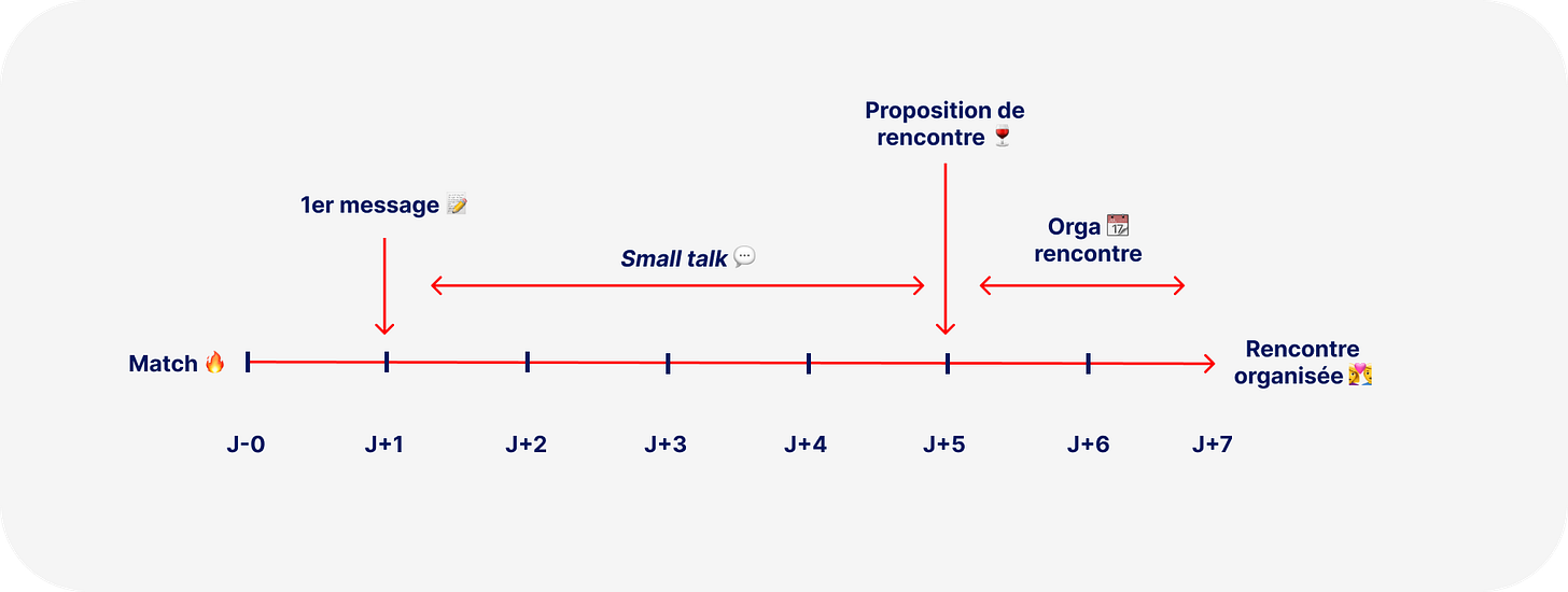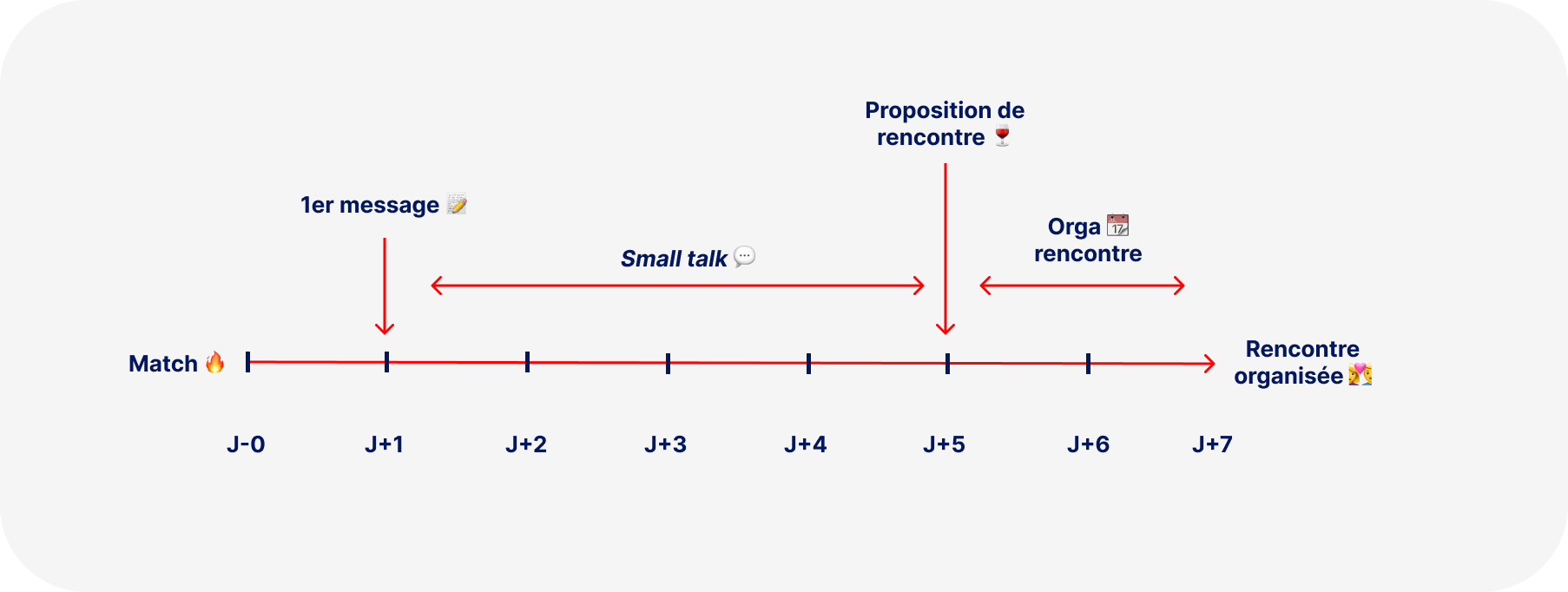 Maintenant que la vision dâensemble est plus clair, nous pouvons zoomer sur la phase de discussion virtuelle succĂ©dant Ă un match et prĂ©cĂ©dant une rencontre. Voici une petite frise que jâai créée, afin de vous montrer quel est, selon moi, le scĂ©nario idĂ©al dâune conversation sur une app :