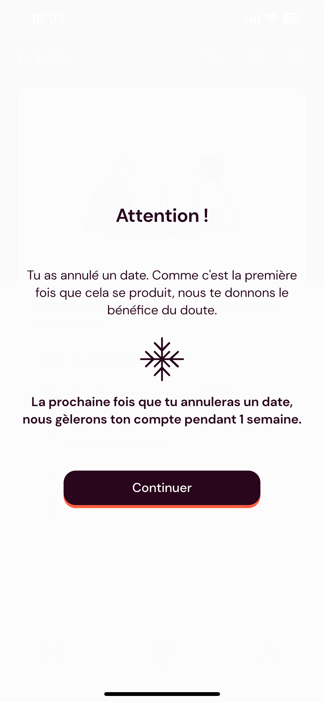- “Le compte des ghosteurs·ses est gelé”. Sur le papier, l’idée est top. Mais…j’ai testé, j’ai matché et j’ai directement annulé le date (oui pas très sympa mais j’avais tout précisé sur mon profil) et la vérité est un peu différente (cf capture d’écran ci-dessous). En vérité, les ghosteurs ont le droit à une deuxième chance et lorsque le compte est gelé, il l’est uniquement pour 1 semaine…pas terrible !