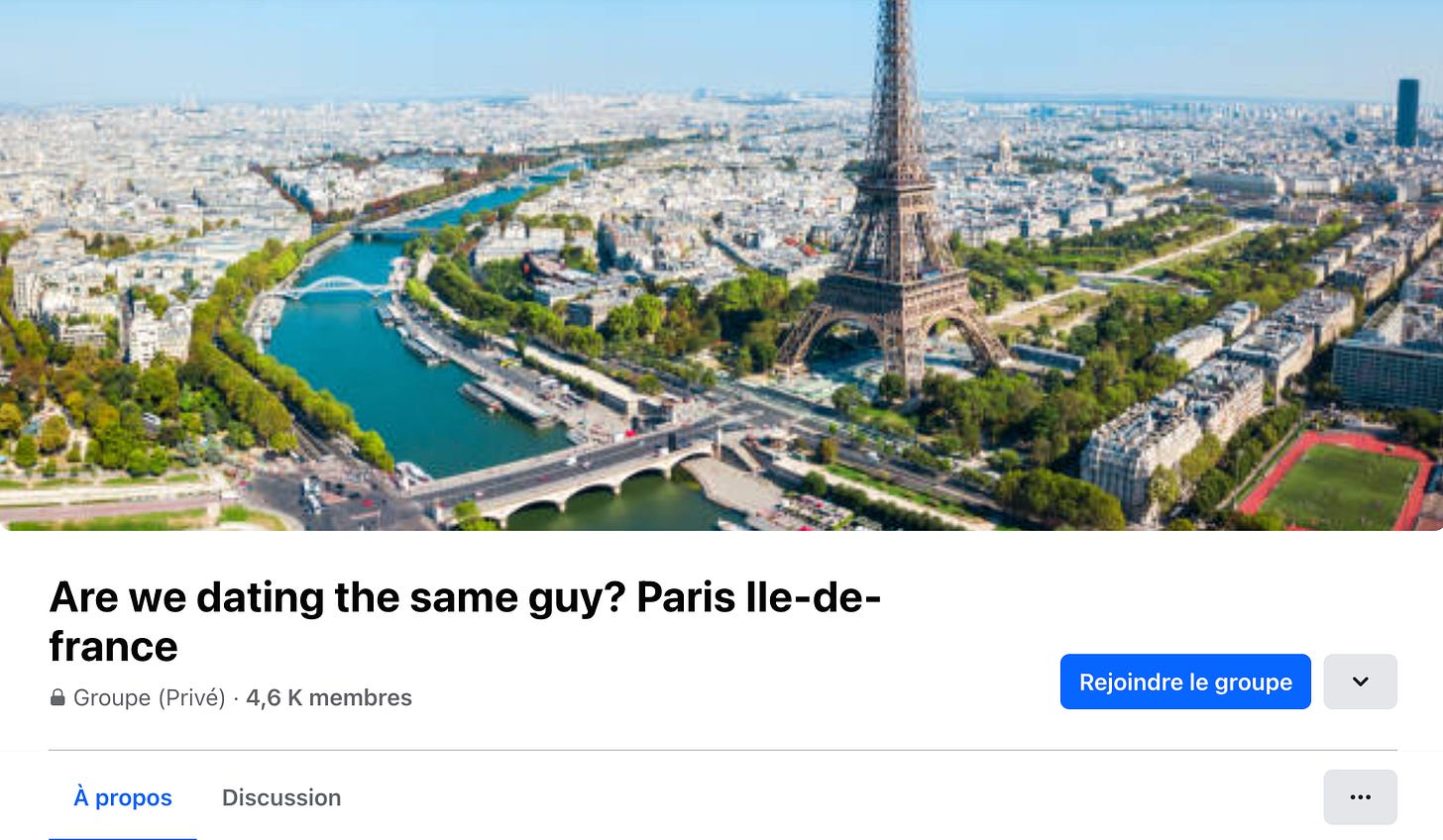 Et ce n'est pas qu'à Paris. Il y a des groupes « Are we dating the same guy » dans chaque grande ville : New York, Londres, Sydney, Berlin, Dublin... Dans toutes les grandes villes occidentales, là où les cœurs esseulés sont aussi nombreux que les pigeons. En faisant un calcul rapide, j'estime qu'il y a probablement un million de femmes dans ces groupes. Ce n'est donc pas juste une tendance passagère des Parisiennes ; c'est un véritable phénomène mondial.