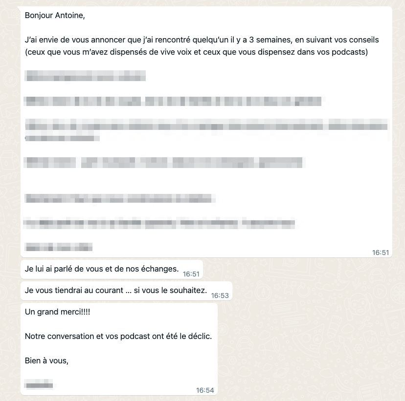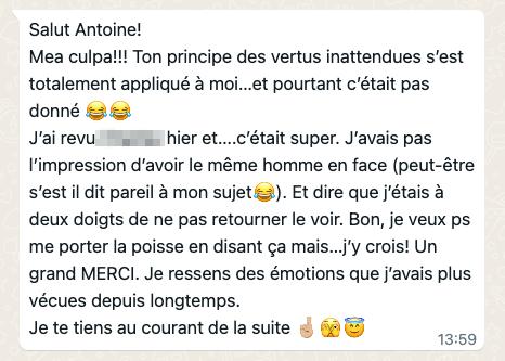 Et aux autres, qui nâont pas encore fait de retours ou nâosent peut-ĂȘtre pas en faire : nâhĂ©sitez surtout pas. Je rĂ©ponds Ă tous vos messages gĂ©nĂ©ralement en moins de 48 heures. Vous pouvez mâĂ©crire sur Whatsapp pour me poser une question ou me partager un avis, au 0749640668.