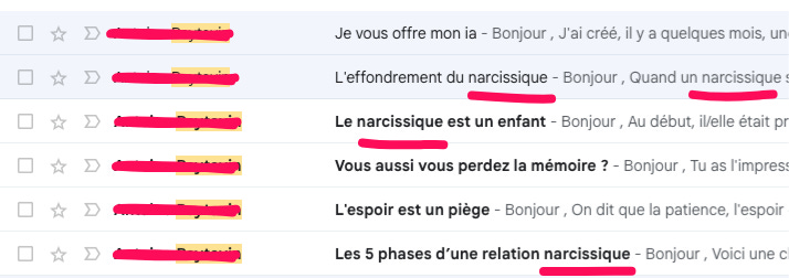 Sur ces six emails, le mot « narcissique » apparaît quatre fois dans les titres.